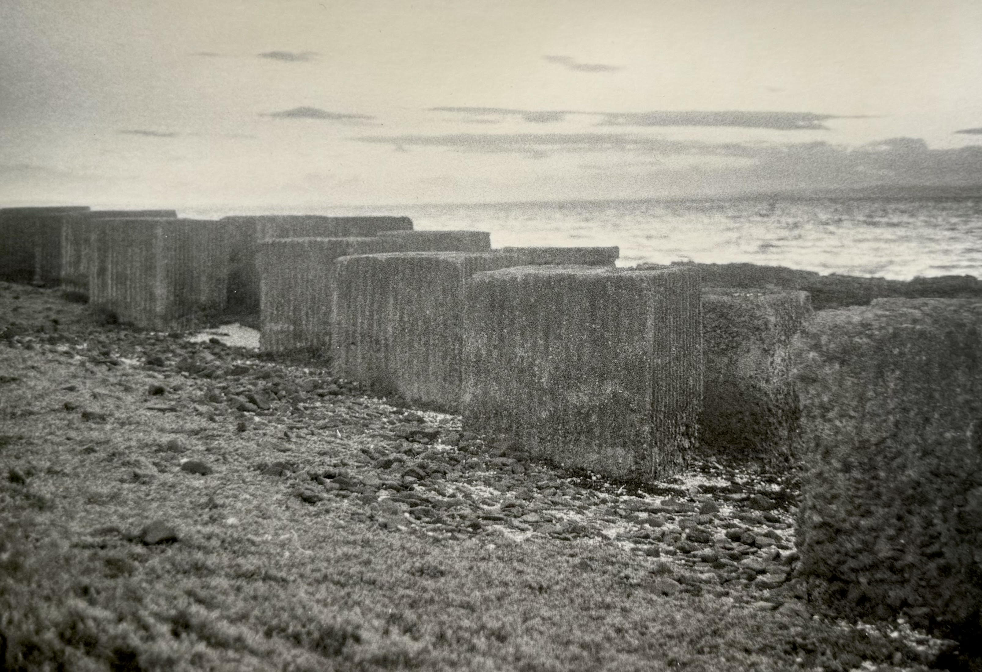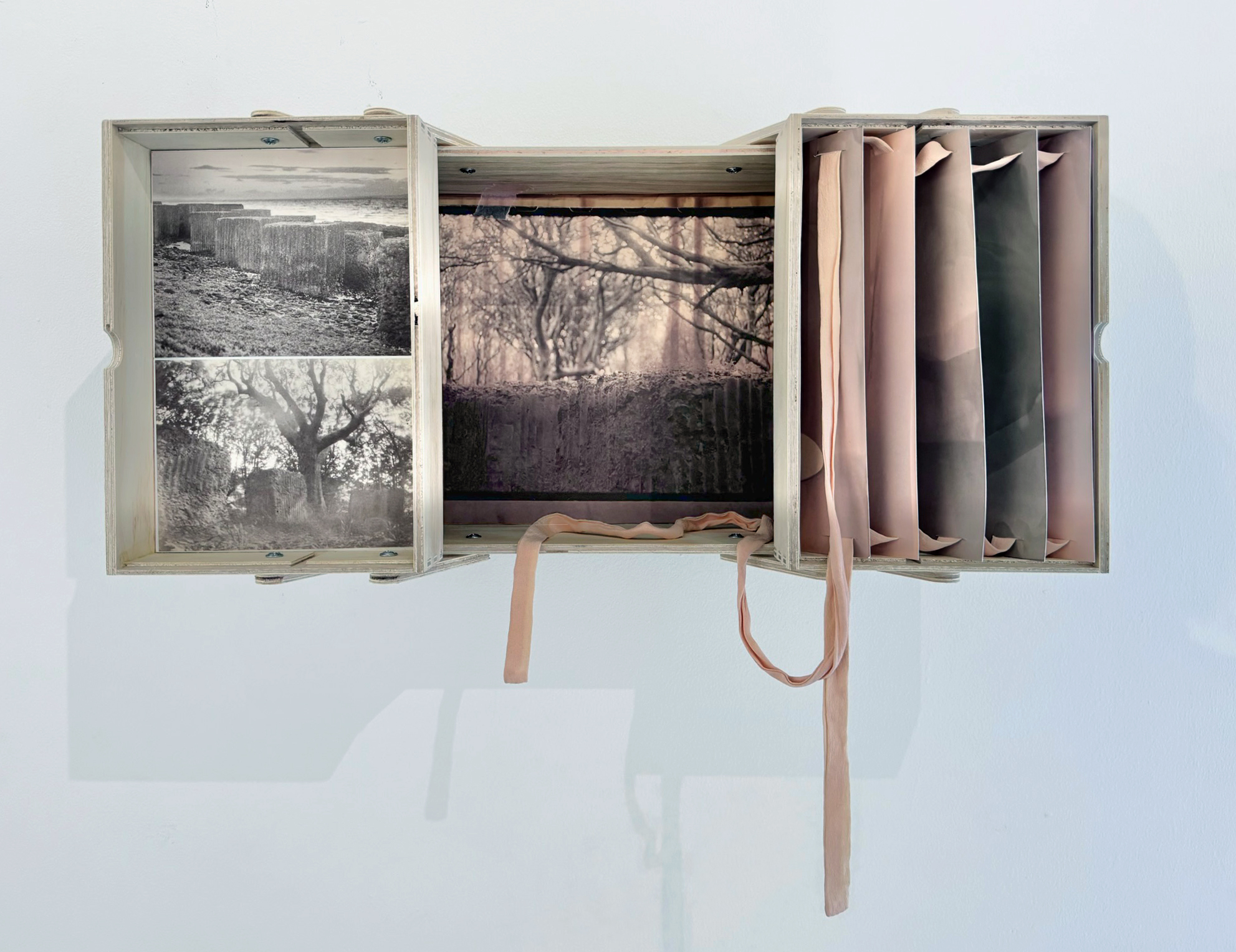 This expanded environmental photographic work from the artist’s ‘folding, faulting, uplift’ series 2024-25, was exhibited at Photo Fringe 2024’s Collectives Showcase in Brighton with the London Alternative Photography Collective’s curated Symbiosis III exhibition, which ran from Oct 4th – Nov 17th. The work contains analogue silver gelatin prints whose negatives were captured on location in East Lothian, Scotland, with pinhole cameras made from household waste and a mid century 35mm SLR camera. The darkroom prints were created using homemade seaweed developer foraged carefully from the beach sites. These chosen locations are close to the birthplace of John Muir, founder of environmental conservation and the USA’s National Parks System. This long form site specific series explores our increasingly fragile environmental & political landscape through the lens of Muir and Scottish Enlightenment figure James Hutton whose coastal geological discovery, close to Muir’s later birthplace, redated the earth as vastly older, more complex and interconnected than previously understood. The series’ title takes it’s name from this geological find. Both are framed through the existing, haunting fragments of WW2 coastal defense anti-tank concrete blocks which formed colossal chains, built by ordinary hands, to repel the then very real threat of Nazi invasion. The delicate silk woven through the layered folds of chemigram prints, which were made with plants found within and around from sites, is the tie from a WW2 period women’s indoor house coat.
