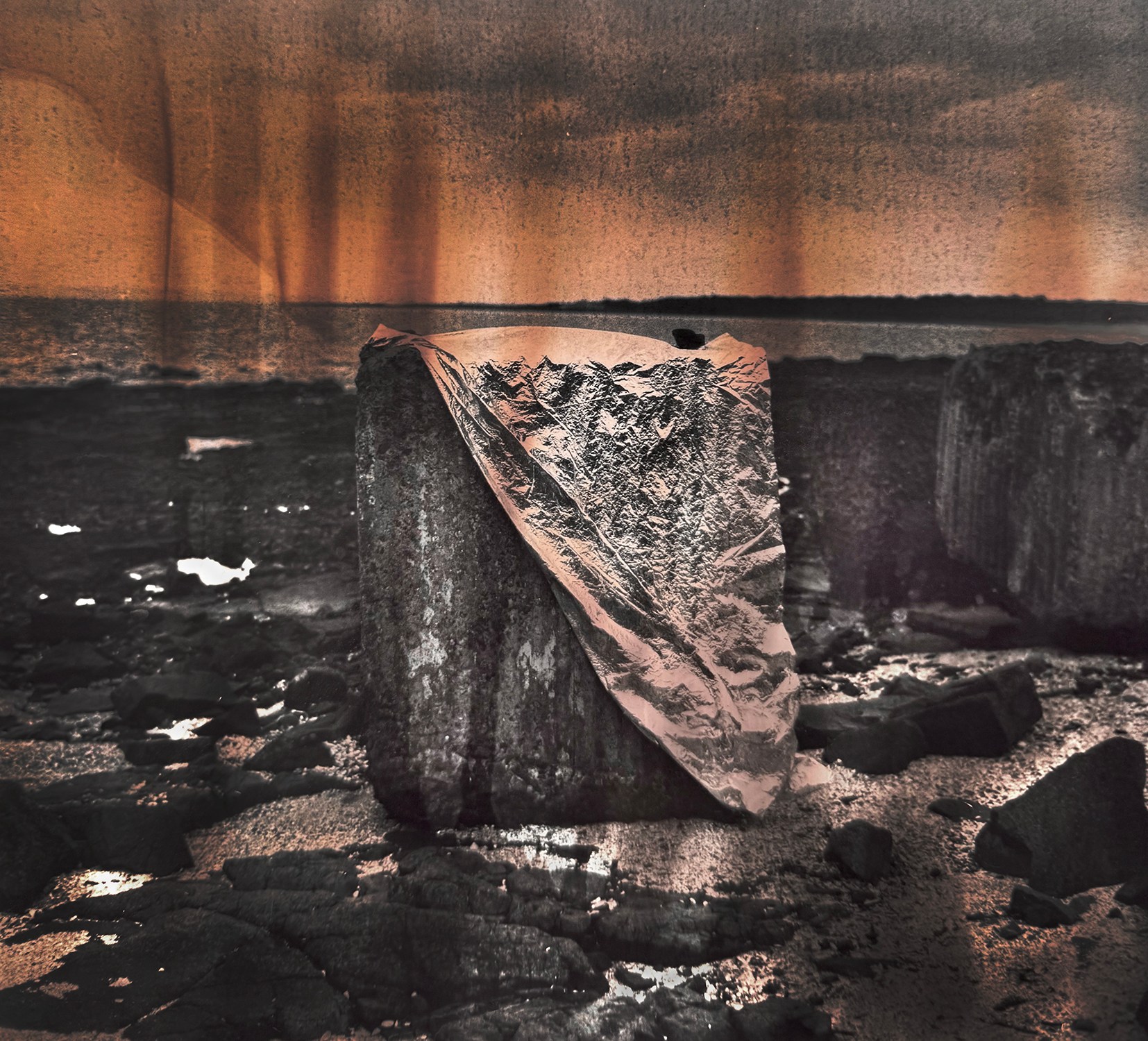 This image was chosen as 1 of 100 photographic works selected from an international open call by Shutter Hub to form their latest Editions publication ‘To The Sea’. The photograph is from artist Hardie’s expanded environmental photography series ‘folding, faulting, uplift (broken chain)’ 2024-25. This analogue photography series works integrally and contextually with plant based processes to increase it’s sustainability and to holistically embed environmental concerns and a journey towards solutions within the work itself. For this print the artist worked with seaweed sourced carefully from the coastal site it records in East Lothian, Scotland to develop and tone the work.